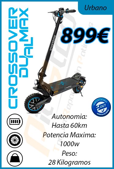 El SmartGyro Crossover Max es una versión mejorada del Crossover. Este modelo es más potente y tiene una mayor autonomía, gracias a su potencia máxima permitida por ley de 1000W, dividida en dos motores de 500W cada uno.