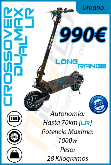 Para quienes no se conformen con la ciudad, esta la versión mas TOP, el smartGyro Crossover MAX, un patinete para todos los terrenos y situaciones, y si tu situación requiere recorrer largas distancias, dispones del modelo smartGyro Crossover MAX LR, la versión Long Range.